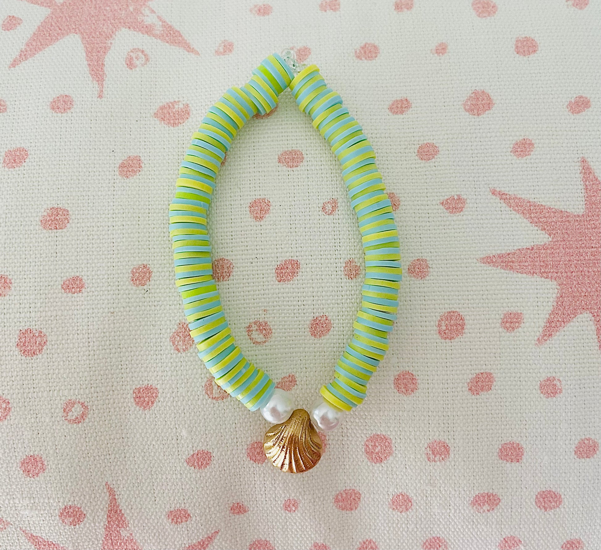 Beach Babe is a very unique bracelet in many ways, to start its base is baby blue mixed with pastel yellow. In the middle are 2 pearls with a gorgeous gold shell. This bracelet will constantly remind you of a perfect summer!